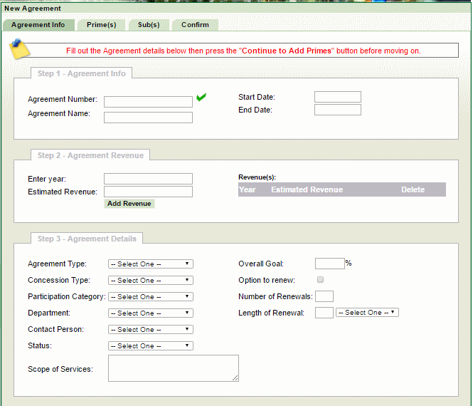 The Agreement Information tab contain general information about the profile of a concessions agreement. This is where an agreement is created via the user interface. This tab has three sections: