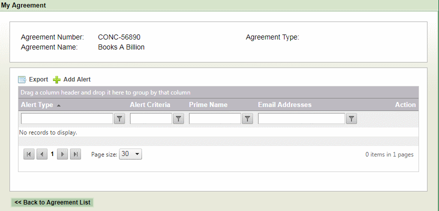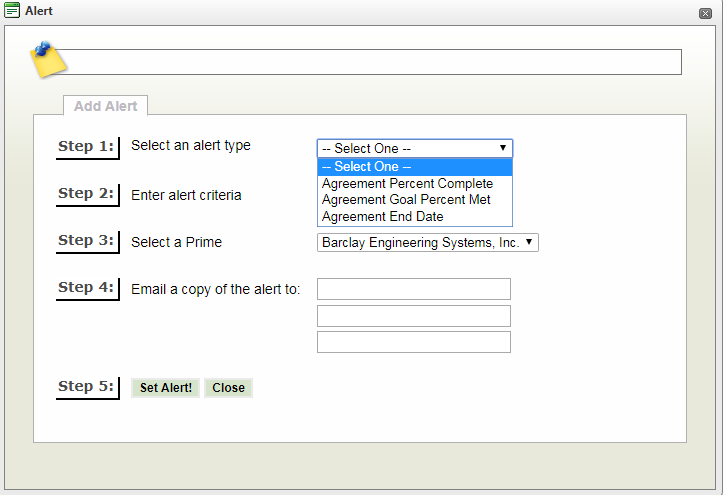Alerts are another way to keep a constant handle on the status of your agreements. They allow you to set up alerts for PRISM to email you when certain conditions about your agreement are met. The Concessions alerts section is accessed from the Small Hamburger Menu menu through the "Alerts" option.