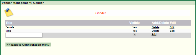 Navigation: Reference Manual > The PRISM Modules > Vendor > Configuration > Gender |