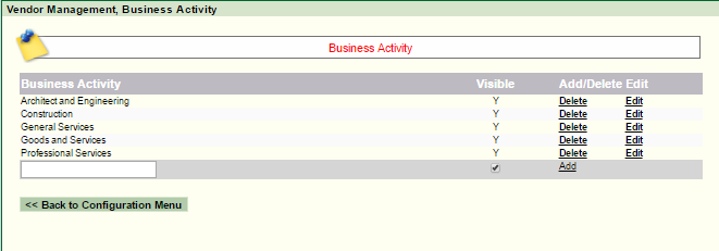 Navigation: Reference Manual > The PRISM Modules > Vendor > Configuration > Business Activity |