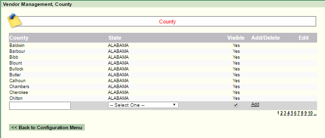 Navigation: Reference Manual > The PRISM Modules > Vendor > Configuration > County |