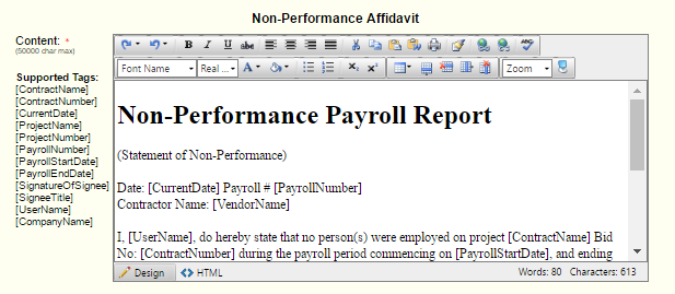 Use the Supported Tags to add specific payroll or vendor information to the statement. The actual information will show during runtime.