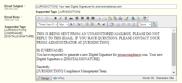 Digital Signature email settings allows you to configure two emails that the vendors get when generating a new digital signature or certifying a payroll. Both of the emails have standard language but may be modified if required.