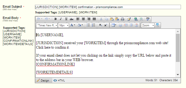 This email is sent to a vendor if the email confirmation (above) is enabled. Otherwise the digital signature suffices for the certification of payroll. The supported tags may be added to your message.