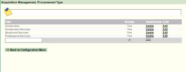 Navigation: Reference Manual > The PRISM Modules > Acquisitions > Configuration > Procurement Types |