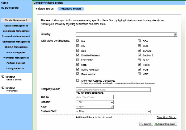 The filtered search provides a user with the ability to find vendors based on specific criteria, and is tailored specifically to the jurisdiction's certification types. It allows a user to search for vendors using up to 12 different filters such as industry, activity status, and revenue. The more information that you enter into the filters, the more narrow your search results will be. Users may export (Excel) search results. This search can only be found in the vendor management module and certification management module.