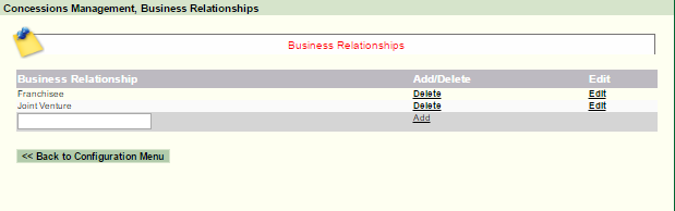 Navigation: Reference Manual > The PRISM Modules > Concessions > Configuration > Business Relationships |