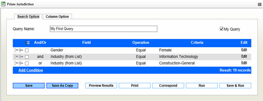 The PRISM Advanced Search provides more latitude for performing ad-hoc searches. It allows a user to combine more conditions and field selection into a search. Furthermore, a user can send the results to the Correspondence Center, printer, and even save the search for later use. It is the most powerful of the searches.