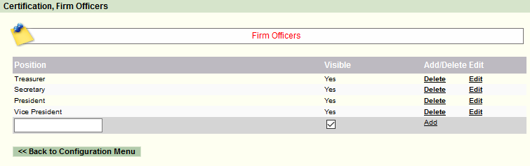 This page allows you to configure your Firm Officers for the dropdown list in the Certification module.