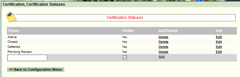 Navigation: Reference Manual > The PRISM Modules > Certification > Configuration > Certification Statuses |