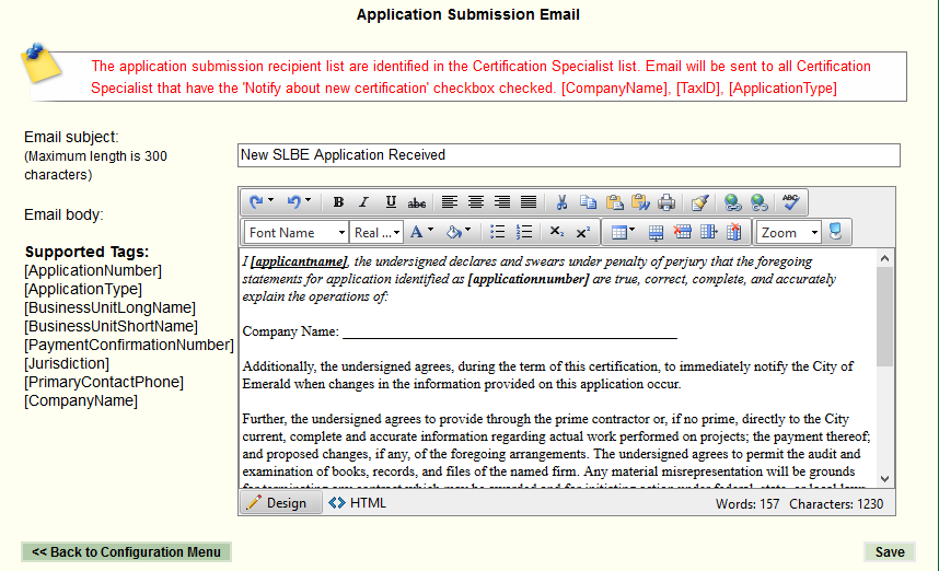 This is the page that allows you to configure the messages that are sent out as a part of your Online Application.
