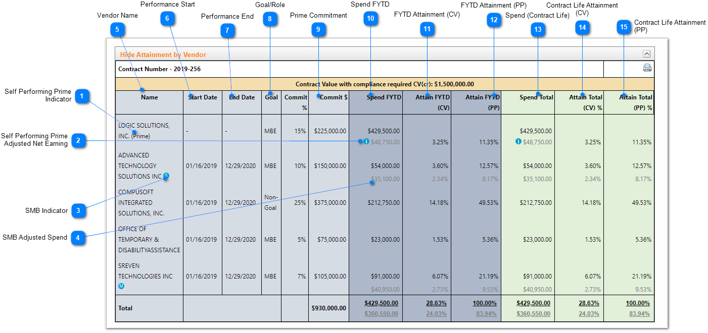 If a Prime is self performing, they are listed first and their name is followed by "(prime)". The sub or prime (self reporting) name. In this case Logic Solutions is self performing 15 as an MBE. |