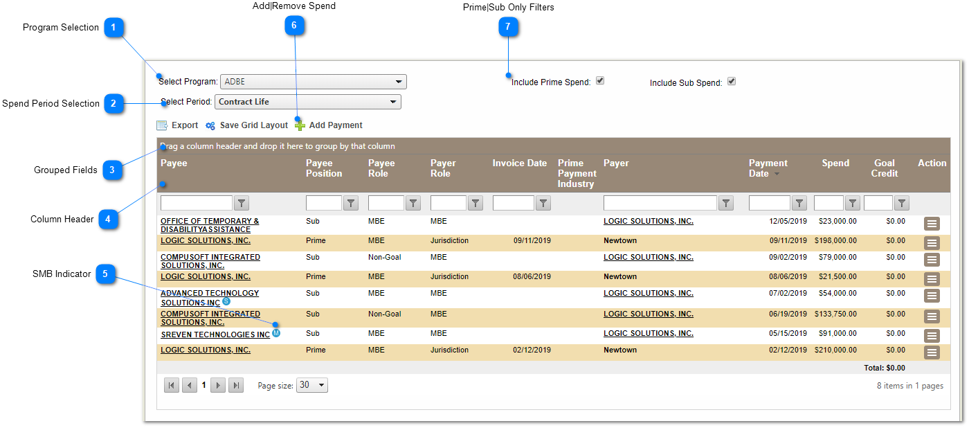 This table shows prime and sub payments along with other pertinent payment data. Adding prime or sub spend is also performed here.