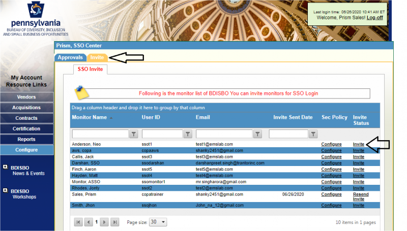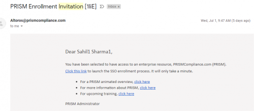 PRISM will send invitations (as email) to monitors. the invitation has a link that will perform the SSO enrollment. Only the SSO Administrator can perform this operation. There are two ways to perform this operation:
