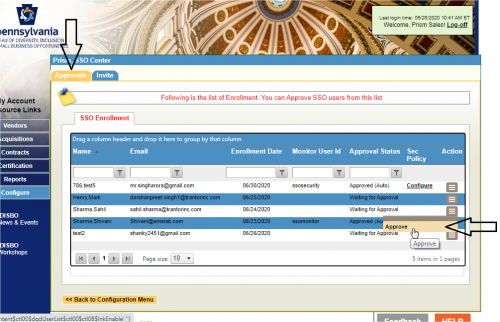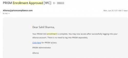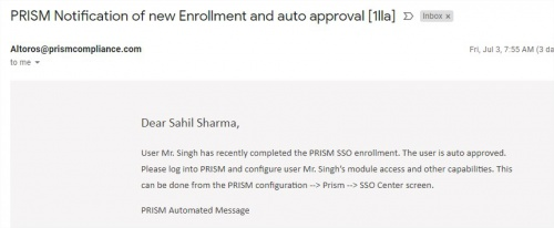 The automatic approvals are done by PRISM in specific conditions. A SSO user is eligible for auto approval, if during the enrollment process, the users email address (in identity provider of jurisdiction) matches with the email address on which the invite was sent from PRISM.