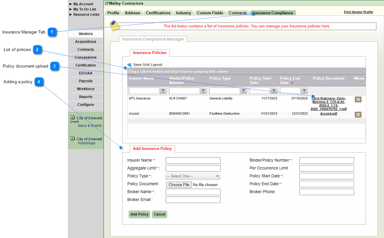 The Insurance Manager is part of the Vendor Management module. The Insurance Manager screen can be found on the vendor record tab. Select a target vendor and click the Insurance Compliance tab.