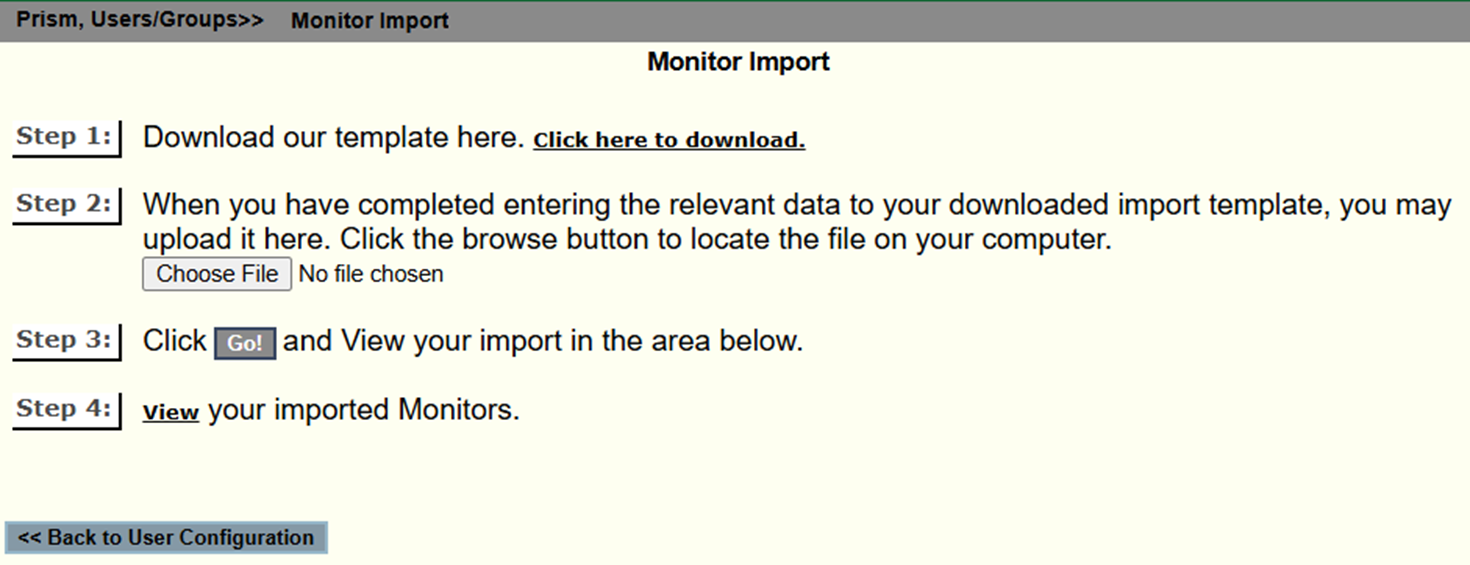 The import monitor utility will import monitors into PRISM. This import will establish user accounts for the monitors. Note, this utility should not bes used if the jurisdiction is using SSO. The best process to use is to perform the following: