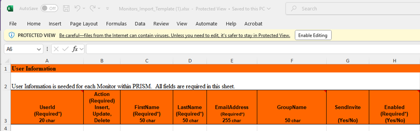 4. Enter the user/monitor information into the template. Use "Update" as the "Action" (Column B).