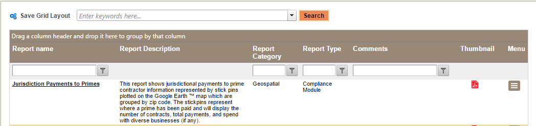Report Name Report Description - Default report description Report Category - The level of the report Executive, or Federal, or Management, or Working Report Type - The module the report is most likely associated Comments - Your jurisdiction comments about the report. Populate this field by using the "Comments" option from the small Hamburger menu - For example, place how often the report should be ran or clarification of the report parameters. Thumbnail -An example of what the report looks like. The example is not rendered using your data Menu - The small hamburger menu