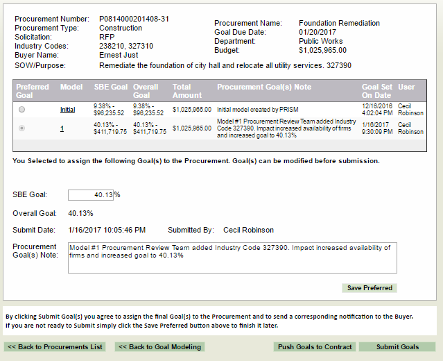 Note: PRISM will prepare the initial goal recommendation based on the goals selected and the information from the procurement categories. This is called the initial model
