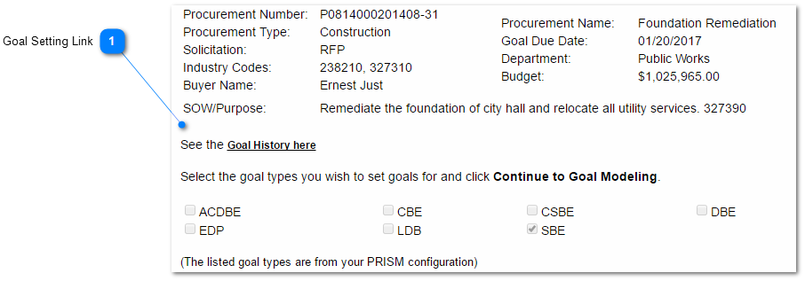 Viewing the Goal History will show the goals that were established for procurements of similar type and size. Type is defined by the industry code that is assigned to the procurement. Size is the based on +- 20% of the procurement budget compared to procurements that have been awarded.