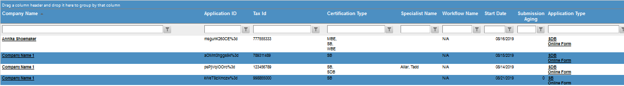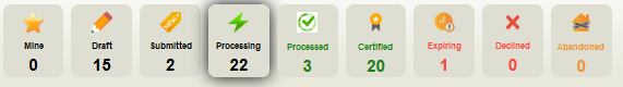 Mine: populates the grid with applications the user has bookmarked. Draft: indicates the applicant is still in the process of entering their application. Submitted: displays applications that have been submitted. Processing: displays submitted applications that have been accepted to be reviewed by specialist. Workflow starts here. Processed: displays applications that have completed the workflow process. Certified: displays applications that have been approved for certification by your jurisdiction. Expiring: displays applications from Certified quick filter that have not been accessed in x number of calendar days (configurable). Declined: displays applications that have been declined for certification. Abandoned: displays applications from Draft that have not been accessed in x number of calendar days (configurable). |
