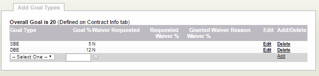3.Click "Continue to Goals". This is where the anticipated enterprise goals are assigned to the contract. Select a goal type and enter the goal. If a waiver was granted for the contract, check the waiver box, and enter the requested percentage, the granted percentage, and the waiver reason. Click "Add" to add the goal to the table.